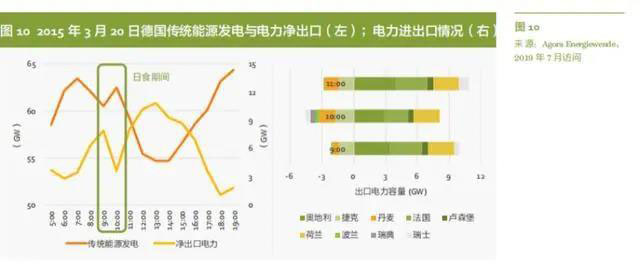 德國(guó)作為擁有高可再生能源發(fā)電裝機(jī)占比的國(guó)家,跨境電力傳輸在可再生能源消納方面發(fā)揮了重要作用,例如當(dāng)?shù)聡?guó)可再生能源發(fā)電大發(fā)時(shí)刻,奧地利和盧森堡會(huì)從電力市場(chǎng)中購(gòu)買大量德國(guó)電力,以享受低廉的價(jià)格。同時(shí)在應(yīng)對(duì)突發(fā)事件時(shí),跨境輸電也為德國(guó)電力系統(tǒng)穩(wěn)定運(yùn)行和安全供給提供了保障,例如 2015 年 3 月 20 日的“日食危機(jī)”,9~10 點(diǎn)之間德國(guó)從丹麥進(jìn)口電量增加了 169%,從對(duì)瑞典的電力出口轉(zhuǎn)向電力進(jìn)口,此外瑞士也為德國(guó)額外提供了 42.3 萬千瓦的發(fā)電容量支持。