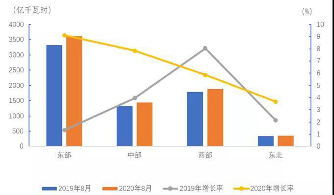 8月份,東、中、西部和東北地區(qū)全社會(huì)用電量增速分別為9.1%、7.8%、5.9%和3.7%,其中,東、中部和東北地區(qū)全社會(huì)用電量增速比上月提高7.1、11.9和1.2個(gè)百分點(diǎn),西部地區(qū)全社會(huì)用電量增速比上月回落1.9個(gè)百分點(diǎn)。