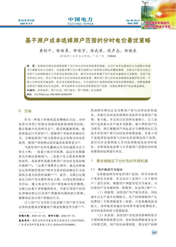 傳統(tǒng)的分時(shí)電價(jià)政策忽略了用戶參與分時(shí)電價(jià)政策的意愿,且用戶電價(jià)電量響應(yīng)行為建模未考慮用戶調(diào)整用電行為成本,為此提出基于用戶成本選擇用戶范圍的分時(shí)電價(jià)最優(yōu)策略。分析用戶改變用電行為所產(chǎn)生的調(diào)整成本與節(jié)省用電費(fèi)用的關(guān)系,推導(dǎo)分時(shí)電價(jià)機(jī)制下用戶電價(jià)電量響應(yīng)行為模型。當(dāng)用戶改變用電行為后,其生產(chǎn)成本高于實(shí)行分時(shí)電價(jià)前的電費(fèi),則對(duì)用戶參與分時(shí)電價(jià)政策的意愿評(píng)估為零,不納入分時(shí)電價(jià)實(shí)施范圍。仿真及實(shí)驗(yàn)結(jié)果顯示,與不選擇用戶范圍的傳統(tǒng)分時(shí)電價(jià)模型相比,該模型能夠反映用戶調(diào)整用電行為過程,科學(xué)選擇參與分時(shí)電價(jià)政策的用戶范圍,實(shí)現(xiàn)電網(wǎng)和用戶的總效益最優(yōu)。