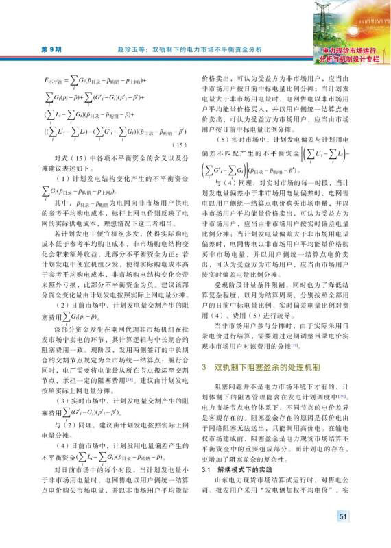 在中國的電力體制改革進程中,計劃與市場共存的局面短期內不會改變。隨著市場進一步放開,計劃與市場解耦運行的模式不可持續(xù),但不解耦模式下不平衡資金問題更為顯著。以不解耦模式為背景對不平衡資金展開討論,通過對不平衡資金計算公式的拆分,得到資金來源相對明確的各個部分,提出不平衡資金的疏導方案。同時,根據(jù)理論阻塞盈余及市場用電量所占比例,提出對市場阻塞盈余的處理建議,并通過算例說明了該方法對不解耦模式的適應性。