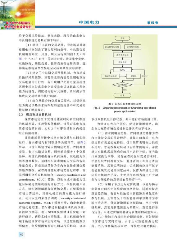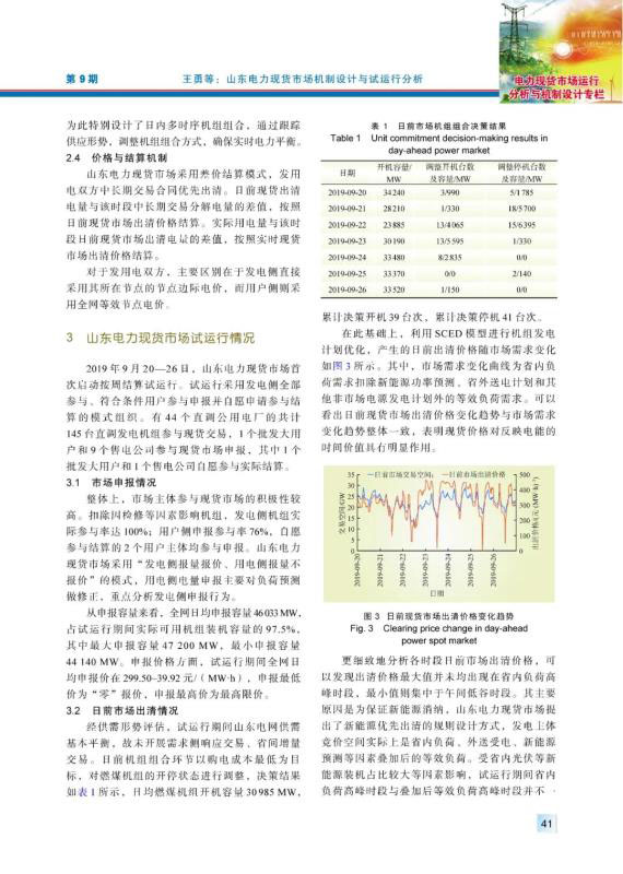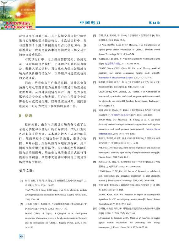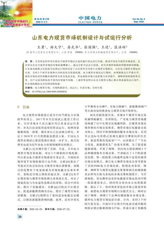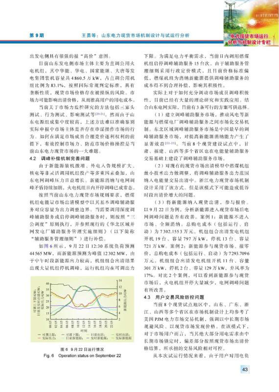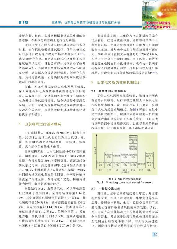 為及時總結(jié)中國首批電力現(xiàn)貨市場試點建設(shè)地區(qū)的試運行經(jīng)驗,推動中國電力現(xiàn)貨市場建設(shè),在介紹山東電力現(xiàn)貨市場的市場機(jī)制基礎(chǔ)上,通過分析其試運行情況,研究市場所面臨的問題和解決措施。山東清潔能源占比較高等電網(wǎng)運行特征決定了山東更宜采用集中式現(xiàn)貨市場模式。山東電力現(xiàn)貨市場包括日前、實時2個時序市場和日內(nèi)機(jī)組組合銜接機(jī)制。電力現(xiàn)貨市場試運行期間,電網(wǎng)整體運行平穩(wěn)有序,現(xiàn)貨市場出清價格隨市場供需關(guān)系變化而變化,但也面臨市場力監(jiān)控能力有待提升、調(diào)峰補(bǔ)償機(jī)制需要完善、用戶交易風(fēng)險防控手段仍待加強(qiáng)等問題。上述結(jié)果表明山東電力現(xiàn)貨市場已基本具備連續(xù)運行條件,但市場機(jī)制的完善仍須持續(xù)加強(qiáng)。