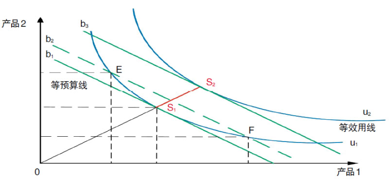 市場競爭也間接地發(fā)生消費(fèi)者之間。最優(yōu)消費(fèi)理論揭示了需求側(cè)不同偏好的消費(fèi)者效用最大化或消費(fèi)支出最小化的規(guī)律。如圖3所示,消費(fèi)者消費(fèi)兩種可替代的商品如產(chǎn)品1和產(chǎn)品2,不同數(shù)量和結(jié)構(gòu)的消費(fèi)產(chǎn)品組合形成了兩條等效用曲線,其中U1小于U2;同時,消費(fèi)者的消費(fèi)預(yù)算支出分別為B1、B2和B3。在等效用曲線U1上,有E、F和S1三個點(diǎn);其中E和F點(diǎn)的消費(fèi)產(chǎn)品組合不同,但消費(fèi)支出相同,即B2;S1點(diǎn)與E、F點(diǎn)的消費(fèi)產(chǎn)品組合不同,消費(fèi)支出也不同,為B1 。由于B1 小于B2 ,而且S1點(diǎn)是唯一的切點(diǎn),因此,在獲得相同效用U1情況下,S1點(diǎn)的消費(fèi)支出最低,所對應(yīng)是產(chǎn)品組合即最優(yōu)消費(fèi)組合。S1和S2是不同消費(fèi)水平下的最優(yōu)消費(fèi)組合。