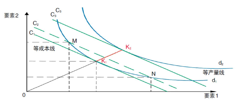 最優(yōu)生產(chǎn)理論揭示了生產(chǎn)者通過要素替代實(shí)現(xiàn)最小成本生產(chǎn)即資源優(yōu)化配置的機(jī)理。假設(shè)初始的要素組合是N點(diǎn),生產(chǎn)者減少使用要素1,同時使用更多的要素2,直到K1點(diǎn)時,就找到了最小生產(chǎn)成本的要素組合。