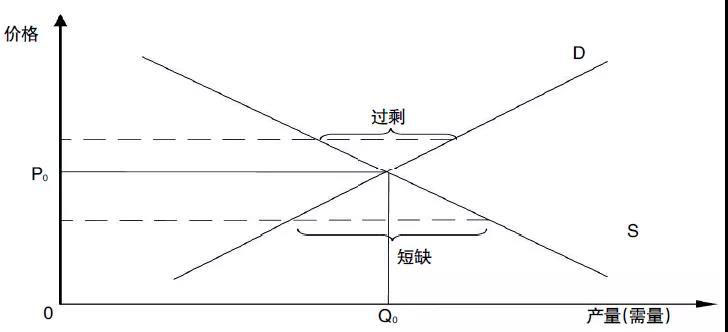如圖1所示,當(dāng)需求曲線D與供給曲線S相交時,市場供應(yīng)與需求相等,市場在產(chǎn)量等于Q0和價格等于P0時出清。在完全競爭市場假設(shè)下,需求曲線與供給曲線的交點(diǎn)可以證明正是滿足邊際收益等于邊際成本條件并且社會福利最大的生產(chǎn)者與消費(fèi)者的長期均衡點(diǎn),Q0和P0分別稱為均衡產(chǎn)量和均衡價格。