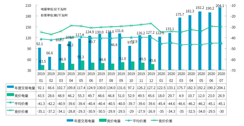 廣東2020年7月份集中競(jìng)價(jià)成交電量為26.9億千瓦時(shí), 同比去年7月下降44.7%,環(huán)比今年6月回升17%;本月競(jìng)價(jià)價(jià)差略升,重回三分,同比去年7月降低0.5元/MWh,環(huán)比今年6月價(jià)差上升0.5元/MWh。