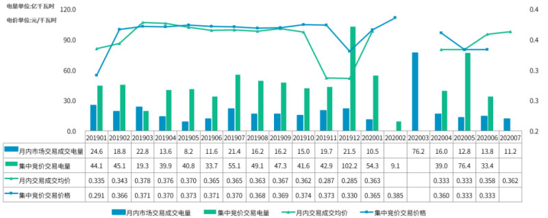 2020年7月份電力市場(chǎng)月內(nèi)掛牌成交電量11.27億千瓦時(shí),同比去年7月下降47.2%,環(huán)比今年6月下降18.1%,成交均價(jià)略升;本月集中競(jìng)價(jià)交易未形成邊際成交價(jià)格,成交電量為0。(因優(yōu)先發(fā)電機(jī)組電量大于月競(jìng)用戶需求電量,沒有邊際價(jià)格成交電量)。