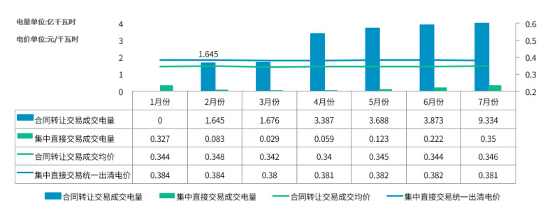 2020年1~7月集中直接交易電量總體穩(wěn)步增長(zhǎng),價(jià)差較為穩(wěn)定,維持在3分以上;其中7月份合同轉(zhuǎn)讓交易電量環(huán)比6月份增加141%,成交均價(jià)波動(dòng)不大,集中直接交易成交電量環(huán)比6月份增加57.7%,出清電價(jià)略降。