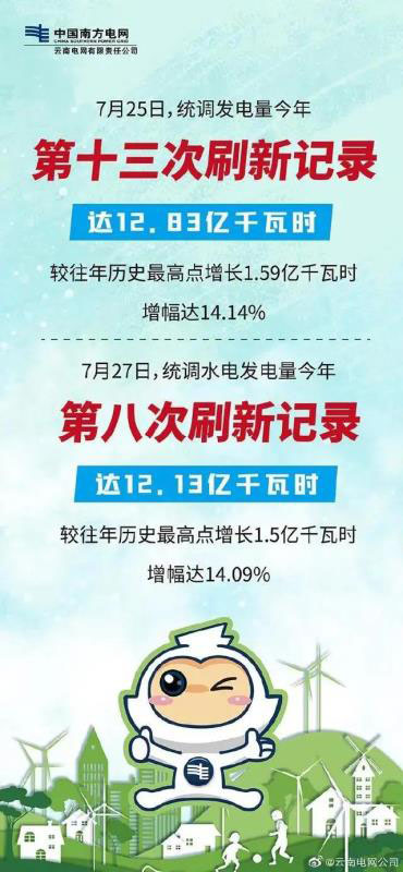 云南電網(wǎng)統(tǒng)調(diào)發(fā)電負(fù)荷、發(fā)電量連續(xù)多次創(chuàng)新高。6月20日、23日和27日,云南電網(wǎng)統(tǒng)調(diào)發(fā)電量連續(xù)3次創(chuàng)歷史新高,分別達(dá)到11.34億千瓦時(shí)、11.58億千瓦時(shí)和11.73億千瓦時(shí)。6月22日、23日,云南電網(wǎng)統(tǒng)調(diào)負(fù)荷連續(xù)2次刷新紀(jì)錄,分別達(dá)到5276.3萬(wàn)千瓦和5337.7萬(wàn)千瓦。而6月23日的統(tǒng)調(diào)負(fù)荷比往年歷史最高點(diǎn)增長(zhǎng)125.6萬(wàn)千瓦,增幅達(dá)2.4%,同比增加1238.9萬(wàn)千瓦,增幅達(dá)30.2%。