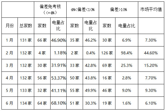 受疫情影響,上半年用電側(cè)偏差率波動較大,總體呈現(xiàn)前高后低,尤其是2月份,當(dāng)月偏差率(絕對值)為44.6%,導(dǎo)致前六個月全市場平均偏差率為15.03%,扣除2月份影響,其余月份偏差率平均值為9.12%。