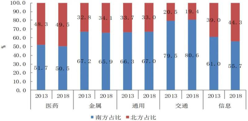 從細分行業(yè)地區(qū)布局看,通用及專用設備制造業(yè)、交通運輸/電氣/電子設備制造業(yè)行業(yè)用電進一步向南方地區(qū)集聚。2013-2018年,南方地區(qū)醫(yī)藥制造業(yè)、金屬制品業(yè)、通用及專用設備制造業(yè)、交通運輸/電氣/電子設備制造業(yè)、信息傳輸/計算機服務和軟件業(yè)用電占其全國用電比重均高于北方地區(qū),其中通用及專用設備制造業(yè)、交通運輸/電氣/電子設備制造業(yè)用電比重分別上升0.7、1.1個百分點。
