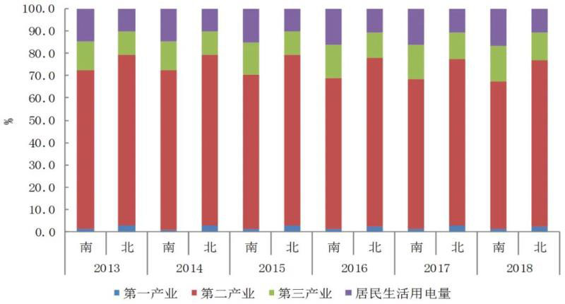 從用電比重看,南方地區(qū)傳統(tǒng)高耗能行業(yè)用電量占其全社會用電量的比重明顯低于北方地區(qū),且持續(xù)下降。2013-2018年,南方地區(qū)傳統(tǒng)高耗能行業(yè)用電占比從25.2%下降到21.0%,下降趨勢明顯;北方地區(qū)傳統(tǒng)高耗能行業(yè)用電占比從38.3%下降到36.1%,呈現(xiàn)緩慢下降態(tài)勢,且高于南方地區(qū)15個百分點左右。