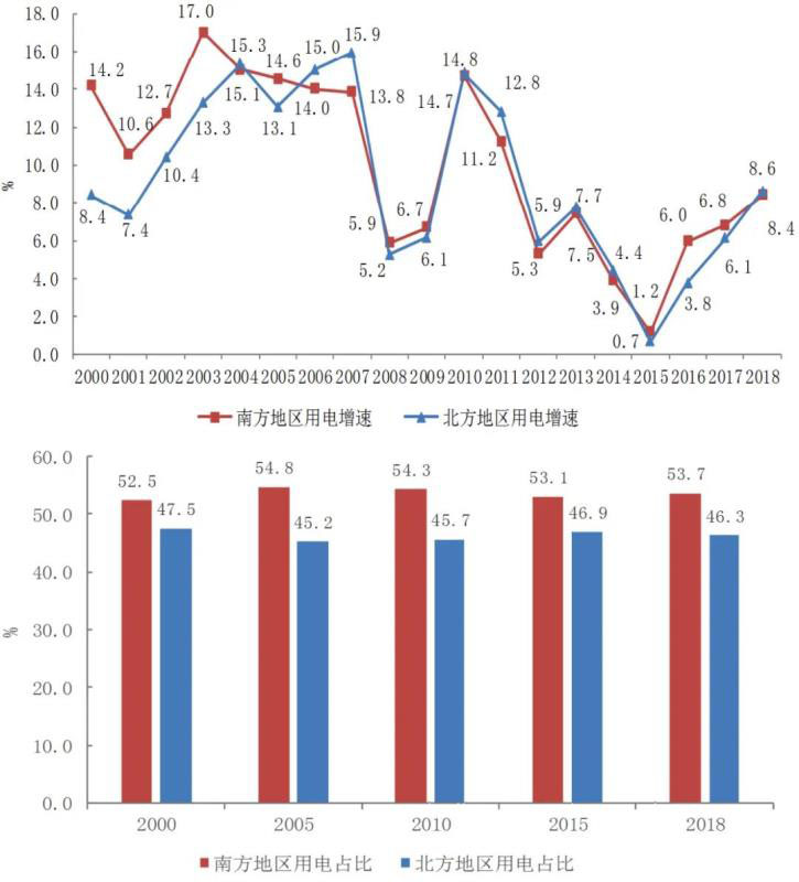 2015年以來,全國地區(qū)用電增速由“北快南慢”轉變?yōu)椤澳峡毂甭保?南方地區(qū)用電占全國比例低于其GDP占全國比例約7個百分點。