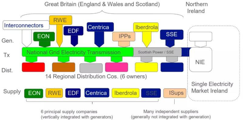 輸電公司。英格蘭和威爾士地區(qū)輸電資產(chǎn)歸屬于英國國家電網(wǎng)公司;蘇格蘭地區(qū)輸電資產(chǎn)歸屬發(fā)輸配售垂直一體化的蘇格蘭電力公司以及蘇格蘭和南方能源集團(tuán)公司。輸電網(wǎng)在英格蘭和威爾士地區(qū)以及蘇格蘭地區(qū)實(shí)行全國統(tǒng)一調(diào)度,調(diào)度機(jī)構(gòu)隸屬于英國國家電網(wǎng)公司。
