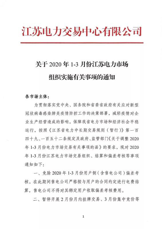 關(guān)于2020年1-3月份江蘇電力市場組織實施有關(guān)事項的通知