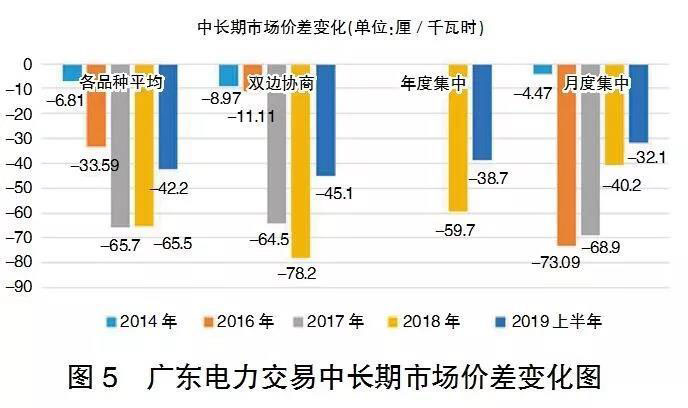 2019年市場規(guī)模放大到2000億千瓦時,但雙邊協(xié)商規(guī)模卻只有1200億千瓦時,供需比仍設(shè)置為1.1。在市場普遍不看好月度競價市場價差的心態(tài)下,雙邊協(xié)商市場的簽約需求大幅提高,市場實際形成了供不應(yīng)求的局面,最終市場價差一路收窄,并在月競階段維持到-30厘/千瓦時左右的穩(wěn)定局面;上半年整體平均價差僅為-42.2厘/千瓦時。