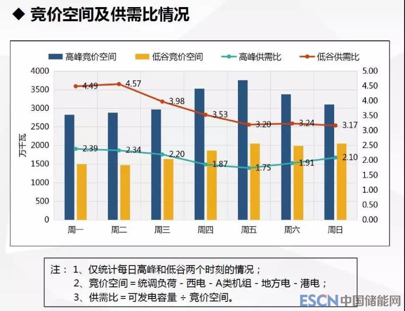 高峰時刻,競價空間平均為3205萬千瓦;供需比最高為2.39,最低為1.75。低谷時刻,競價空間平均為1796萬千瓦;供需比最高為4.57,最低為3.17。
