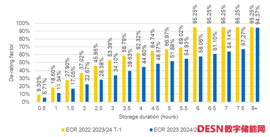 當(dāng)電力需求激增而供應(yīng)不足時,電網(wǎng)系統(tǒng)承受著巨大的運行壓力,容量市場將會向那些可用于能源調(diào)度的資源(例如儲能系統(tǒng))支付費用。這一費用的計算并非一概而論,而是根據(jù)資源在提供備用容量方面的“可靠性”進行加權(quán)。具體來說,資源的“可靠性”越高,其電價獲得的加權(quán)也就越大。對于某種能源來說,其拍賣中所獲得的最高電力價格百分比就是其“降級因素”。這既是對其技術(shù)性能的一種評價,也是對其在電力市場中競爭力的一種體現(xiàn)。