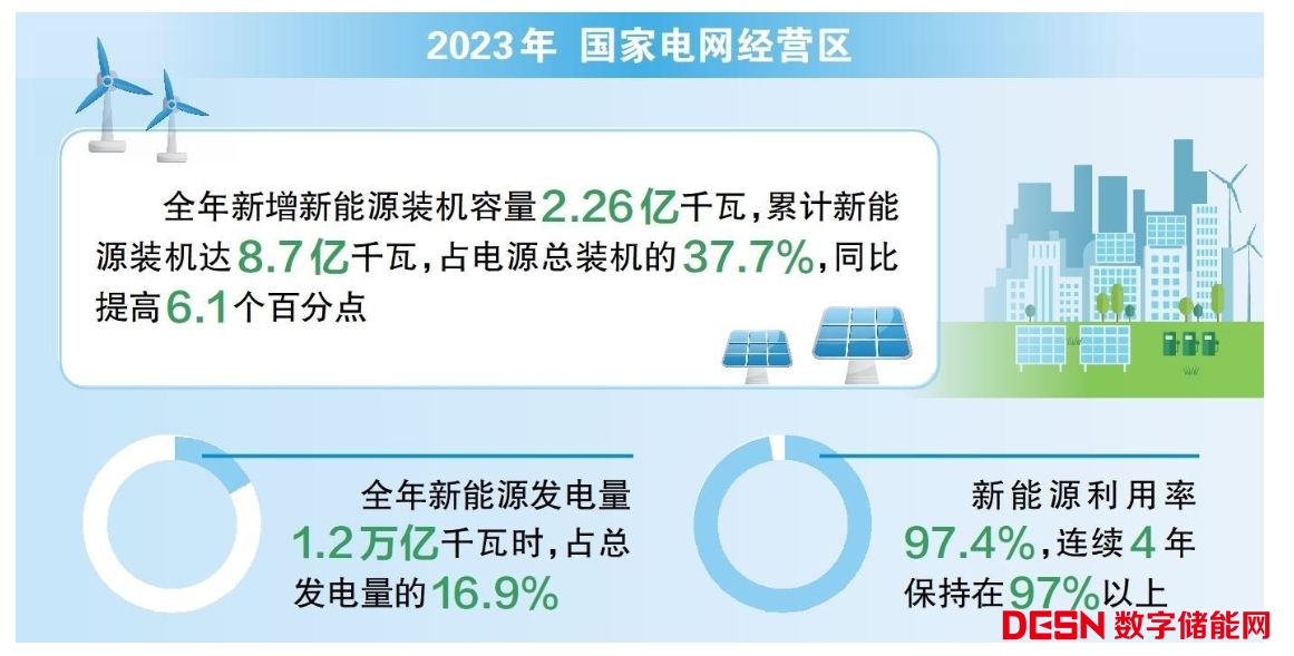 《報告》顯示,2023年公司經(jīng)營區(qū)新能源并網(wǎng)消納主要呈現(xiàn)4個特點:裝機規(guī)模再上新臺階,經(jīng)營區(qū)全年新增新能源裝機容量2.26億千瓦,累計新能源裝機達(dá)到8.7億千瓦,占電源總裝機的37.7%,同比提高6.1個百分點;分布式電源成為增長主體;電力電量屢創(chuàng)新高,全年新能源發(fā)電量1.2萬億千瓦時,占總發(fā)電量的16.9%,同比提高2.0個百分點;利用率保持較高水平,新能源利用率97.4%,連續(xù)4年保持在97%以上。