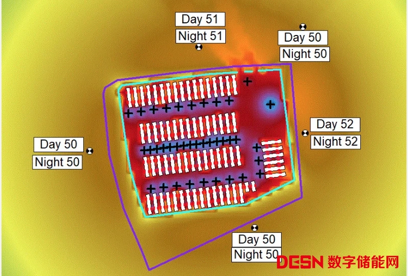 在電池儲(chǔ)能系統(tǒng)的設(shè)計(jì)階段,聲學(xué)顧問(wèn)和技術(shù)專(zhuān)家需要準(zhǔn)確識(shí)別并確定來(lái)自各類(lèi)設(shè)備的關(guān)鍵聲源。設(shè)備供應(yīng)商可能會(huì)提供有關(guān)產(chǎn)品噪音排放的詳細(xì)數(shù)據(jù),這些數(shù)據(jù)有時(shí)是基于對(duì)現(xiàn)有設(shè)施的實(shí)際場(chǎng)地測(cè)量得出的。利用這些數(shù)據(jù)構(gòu)建一個(gè)聲學(xué)模型,該模型能夠模擬電池儲(chǔ)能系統(tǒng)在其周邊(如住宅)產(chǎn)生的聲音水平。這個(gè)聲學(xué)模型不僅包含了電池儲(chǔ)能系統(tǒng)各個(gè)設(shè)備的聲源,還納入了周?chē)鷧^(qū)域的地形特征。建模評(píng)估的最終結(jié)果將與工程項(xiàng)目所適用的噪音限制標(biāo)準(zhǔn)進(jìn)行對(duì)比。電池儲(chǔ)能系統(tǒng)的聲音建模分析示例的結(jié)果如下圖所示。