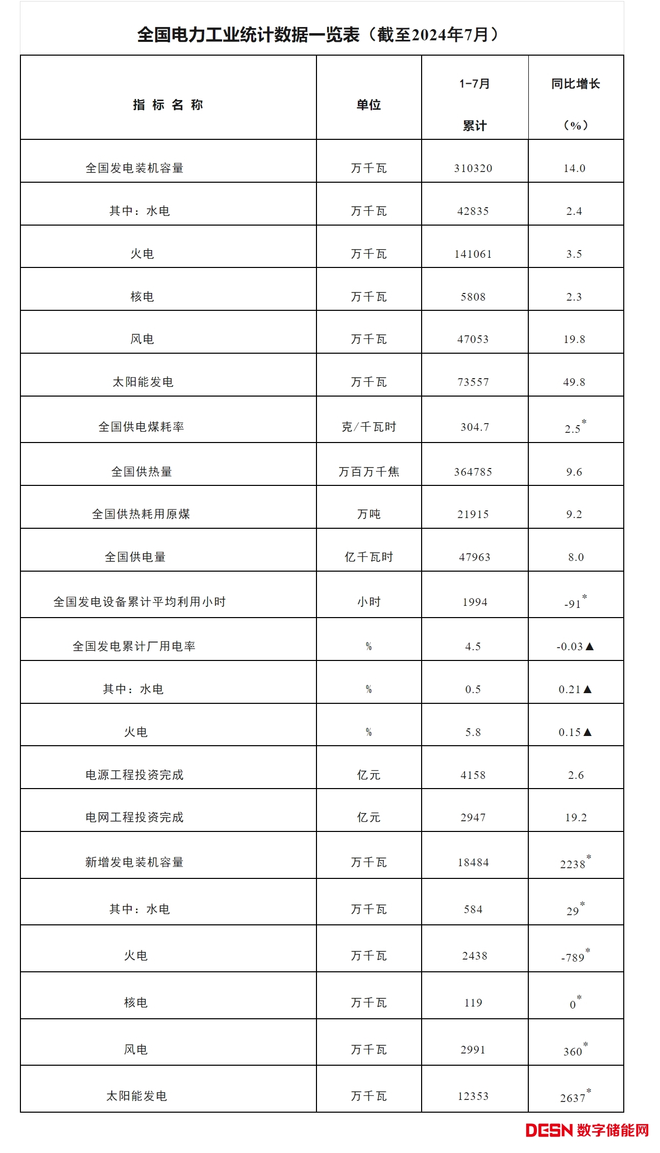 注:1.全國發(fā)電裝機容量及其中的分項指截至統(tǒng)計月的累計裝機容量。 2.全國供電量為調度口徑數(shù)據。 3.“同比增長”列中,標*的指標為絕對量;標▲的指標為百分點。