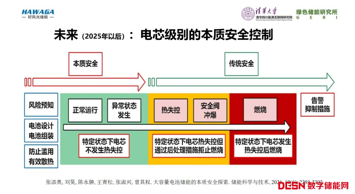 陳永翀說,本質(zhì)安全不等同于絕對(duì)安全。所以不能往“絕對(duì)安全”這個(gè)方向發(fā)展儲(chǔ)能,這是死胡同,也沒有必要。因?yàn)槔碚撋现v,任何含能量的載體都不可能做到絕對(duì)安全。但是有可能做到本質(zhì)安全。也就是電芯可以出問題,可以短路,可以有其他安全故障,但是絕對(duì)不要讓它熱失控?zé)饋?,即在正常工作條件和一定濫用條件下,電芯都不能發(fā)生熱失控,更不能發(fā)生燃燒和爆炸,這是電芯級(jí)別的本質(zhì)安全含義。鋰電儲(chǔ)能最早是從艙級(jí)消防水平發(fā)展到現(xiàn)在模組級(jí)別的安全控制,未來方向一定是往電芯級(jí)別的本質(zhì)安全發(fā)展。