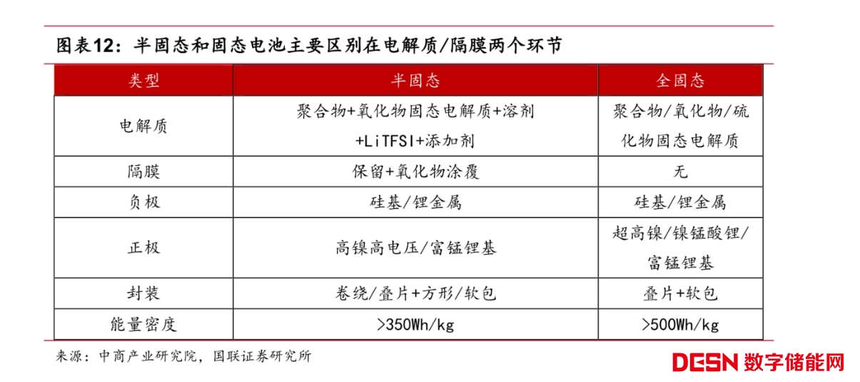不過(guò),據(jù)國(guó)聯(lián)證券研報(bào),半固態(tài)和全固態(tài)在正負(fù)材料路徑選擇上較為一致,正極偏向于高鎳和富錳鋰基材料,負(fù)極采用硅基材料和鋰金屬。從半固態(tài)發(fā)展為全固態(tài)的核心轉(zhuǎn)變?nèi)詾殡娊赓|(zhì)和隔膜材料的改變,全固態(tài)電池將不再依賴溶劑、添加劑等液態(tài)物質(zhì)。