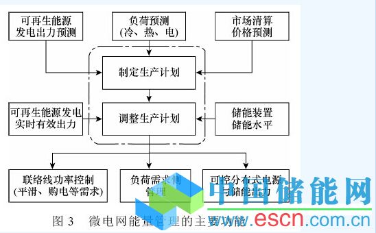 微電網(wǎng)的運(yùn)行優(yōu)化策略由能量管理系統(tǒng)在已知各種運(yùn)行信息的基礎(chǔ)上制定完成。目的是根據(jù)分布式電源出力預(yù)測(cè)、微電網(wǎng)內(nèi)能源需求、市場(chǎng)信息等數(shù)據(jù),按照不同的優(yōu)化運(yùn)行目標(biāo)和約束條件做出決策,實(shí)時(shí)制定微電網(wǎng)運(yùn)行調(diào)度策略,通過對(duì)分布式電源、儲(chǔ)能設(shè)備和負(fù)荷的靈活調(diào)度來實(shí)現(xiàn)系統(tǒng)的優(yōu)化運(yùn)行。能量管理系統(tǒng)的主要功能如圖3 所示。