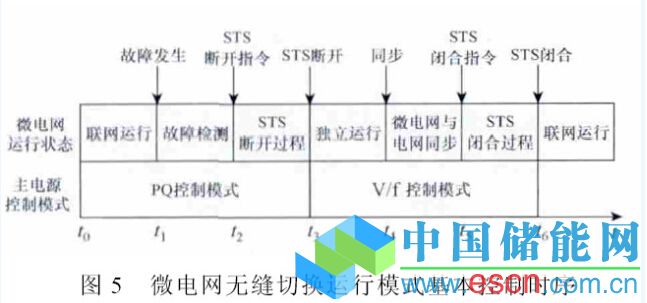 微電網(wǎng)運(yùn)行模式無縫切換控制也在第二層控制中實(shí)現(xiàn),該部分應(yīng)具備電網(wǎng)故障檢測(cè)、微電網(wǎng)與電網(wǎng)同步等功能,并對(duì)微電網(wǎng)并網(wǎng)靜態(tài)開關(guān)和主電源控制模式切換進(jìn)行協(xié)調(diào)控制[36]。當(dāng)采用主從控制模式時(shí),一種典型的控制時(shí)序如圖5 所示,包含微電網(wǎng)運(yùn)行狀態(tài)切換和主電源控制模式切換。若主電源在微電網(wǎng)并網(wǎng)和孤立運(yùn)行模式下均采用P-f和Q-V下垂控制方法,則在微電網(wǎng)運(yùn)行模式切換時(shí),無需切換控制模式[45]。否則,為保證微電網(wǎng)主電源控制模式平滑切換,主電源控制系統(tǒng)在PQ控制和V/f 控制模式之間切換時(shí)應(yīng)盡可能減少切換功率變化量[46]。