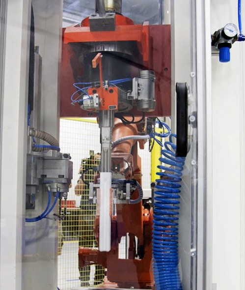 陶瓷材料被壓入磨具成型。圖中后方可見操作這一過程的橙色機(jī)器人,它們正將壓制好的材料從模具中移走。