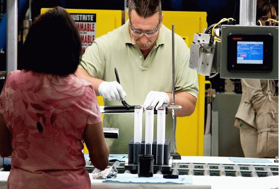 一名工人正將電池組插入封裝外殼,電池中包含有用于控制電池的微處理器,以及讓電池在其適應(yīng)的約300℃工作的加熱器。