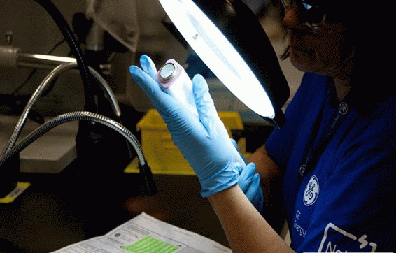 一名工人正在檢查卸下的電解質(zhì)陶瓷。
