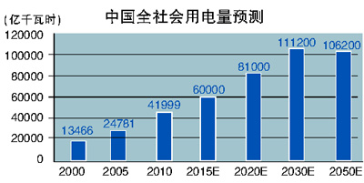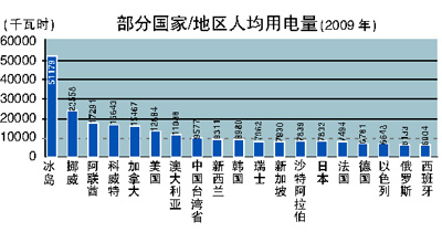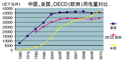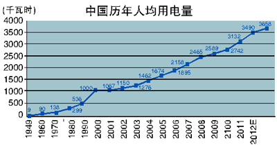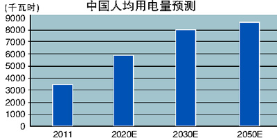 2011年,我國全社會(huì)用電量4.7萬億度,超過美國,排名世界第一。2011年,我國人均用電量3490度,比世界平均水平高約450度,排名世界第五十五位左右。過去十年,我國人均用電量凈增2340度。