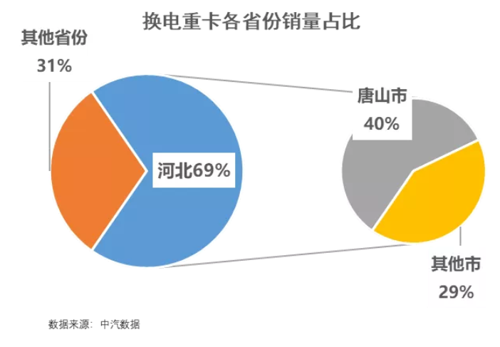 進一步分析換電重卡銷往城市,其中40%在唐山市。主要有兩個原因:第一,唐山已經(jīng)啟動新能源汽車換電模式應用試點工作;第二,唐山地處北京周邊,且為港口城市,鋼鐵廠眾多,重工業(yè)發(fā)達,生態(tài)環(huán)境有待改善,而換電重卡正好適合于港口外駁、物流園區(qū)及鋼廠短駁等高頻使用場景。