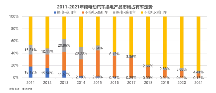 根據(jù)中汽數(shù)據(jù)統(tǒng)計分析,換電產(chǎn)品市場整體占有率較低,最高是在2011年,換電產(chǎn)品占比33.9%,而2019年已降至2.6%。從2020年開始,換電產(chǎn)品占比有所上升,2021年換電產(chǎn)品銷量占比為4.5%。