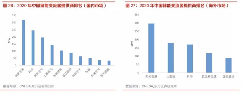 中國(guó)逆變器廠商在全球都占據(jù)了較大的份額。根據(jù)CNESA統(tǒng)計(jì),2020年國(guó)內(nèi)儲(chǔ)能變流器供應(yīng)商前十名累計(jì)出貨量1.27GW。在工商業(yè)級(jí)別,參與者主要有陽(yáng)光電源、華為、上能電器,在戶用級(jí)別,主要有錦浪科技、固德威、德業(yè)。