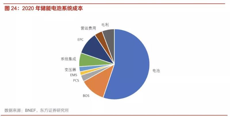 根據(jù)BNEF提供的儲(chǔ)能系統(tǒng)成本調(diào)研數(shù)據(jù),儲(chǔ)能系統(tǒng)成本以電池為主,零部件主要包括電池、變流系統(tǒng)(PCS)、電池管理系統(tǒng)(BMS)等,此外還包括BOS、系統(tǒng)集成、EPC成本等制造成本。其中電池成本占比約為 55%,對(duì)儲(chǔ)能電站成本影響最大,其次為變流系統(tǒng)及 EMS。