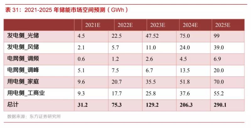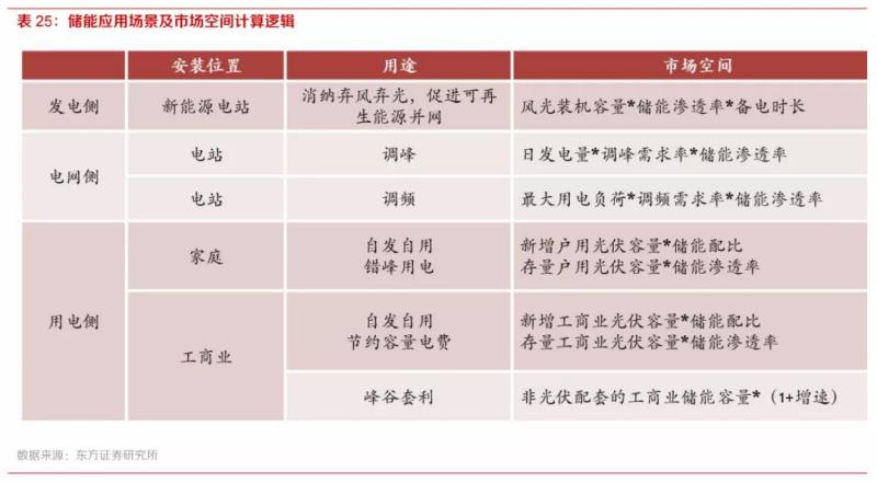 測(cè)算市場(chǎng)空間時(shí),分別考慮了發(fā)電側(cè)、電網(wǎng)側(cè)和用電側(cè)三類場(chǎng)景,根據(jù)安裝位置和用途的不同,分別考慮新能源電站配置儲(chǔ)能,儲(chǔ)能參與調(diào)峰、調(diào)頻,用電側(cè)家庭和工商業(yè)的新增儲(chǔ)能市場(chǎng)空間。