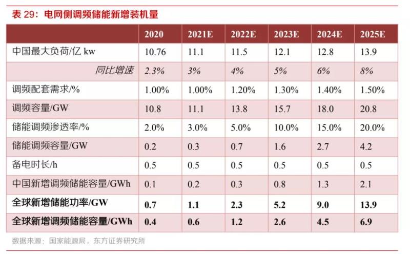 儲(chǔ)能在電網(wǎng)側(cè)的價(jià)值主要體現(xiàn)在電力輔助服務(wù)。調(diào)頻與負(fù)荷波動(dòng)有關(guān),對(duì)于調(diào)頻中儲(chǔ)能的需求,我們考慮調(diào)頻配套需求與最大負(fù)荷的配套比例:根據(jù)業(yè)內(nèi)預(yù)測(cè),一般調(diào)頻功率配套需求2~3%,我國(guó)目前調(diào)頻配套需求較低,約1%。目前,儲(chǔ)能在電力輔助服務(wù)市場(chǎng)的滲透率約為2%,未來隨著儲(chǔ)能相關(guān)政策的促進(jìn)和電力輔助服務(wù)市場(chǎng)的完善,儲(chǔ)能的滲透率將逐年快速提升。根據(jù)估算結(jié)果,全球2025年電網(wǎng)側(cè)調(diào)頻需求帶動(dòng)的儲(chǔ)能需求為6.9GWh。