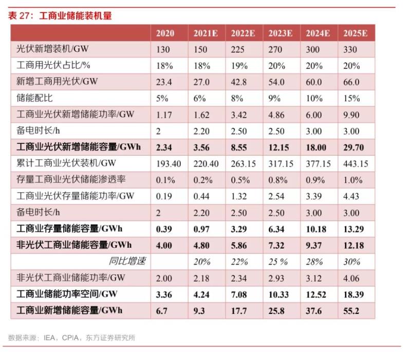 工商業(yè)儲(chǔ)能市場(chǎng)包括光伏工商業(yè)和非光伏工商業(yè)兩類使用場(chǎng)景。其中,光伏工商業(yè)儲(chǔ)能設(shè)備的經(jīng)濟(jì)性來源于電力自發(fā)自用和節(jié)省容量電價(jià)。根據(jù)IEA的統(tǒng)計(jì)數(shù)據(jù),2020年全球新增光伏裝機(jī)量中18%為工商業(yè)光伏,其中,歐洲是第一大工商業(yè)光伏新增裝機(jī)市場(chǎng),新增裝機(jī)6.2GW,中國(guó)新增工商業(yè)裝機(jī)4.7GW,美國(guó)2GW。目前,能量型儲(chǔ)能設(shè)備的放電時(shí)長(zhǎng)要求一般為1-2小時(shí)。由于工商業(yè)生產(chǎn)時(shí)段高峰期和光伏發(fā)電出力高峰期基本重合,我們認(rèn)為工商業(yè)儲(chǔ)能備電時(shí)長(zhǎng)從2小時(shí)逐漸提升到2025年3小時(shí)。按照當(dāng)期儲(chǔ)能配比5%,遠(yuǎn)期20%的配比率進(jìn)行估算,得到全球2025年新增的工商業(yè)光伏配套儲(chǔ)能裝機(jī)容量為29.7GWh。存量光伏工商業(yè)中,假設(shè)儲(chǔ)能滲透率逐漸提升,得到全球2025年存量的工商業(yè)光伏配套儲(chǔ)能裝機(jī)容量為12.29GWh。此外,部分工商業(yè)未安裝屋頂光伏,可以通過安裝儲(chǔ)能實(shí)現(xiàn)峰谷價(jià)差套利收益,這部分市場(chǎng)容量預(yù)計(jì)2025年達(dá)到55.2GWh。