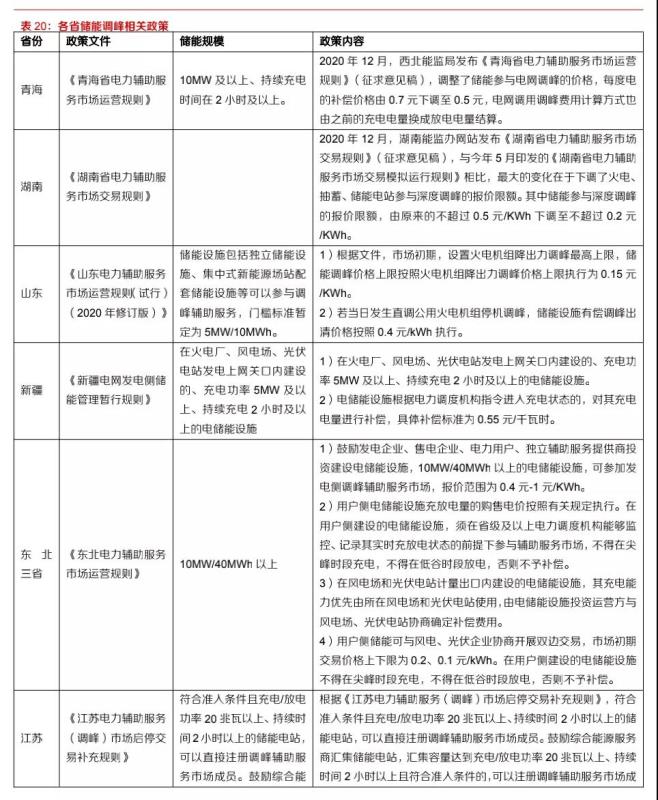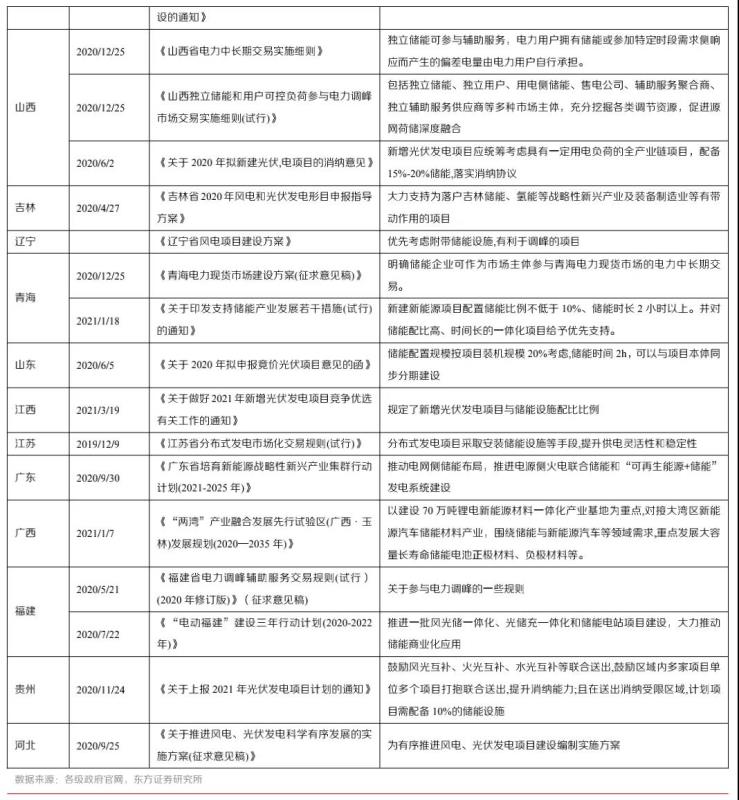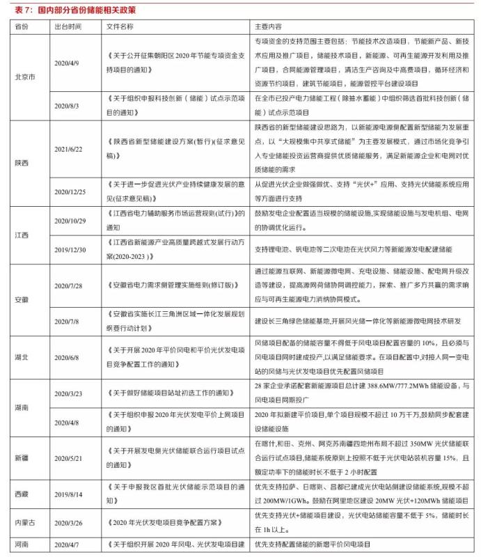 儲(chǔ)能設(shè)備對(duì)于集中式可再生能源發(fā)電站電力消納有重要意義。全國(guó)多地已經(jīng)發(fā)布了優(yōu)先支持配備儲(chǔ)能的可再生能源發(fā)電項(xiàng)目政策,部分地區(qū)還對(duì)儲(chǔ)能設(shè)備的配比、放電時(shí)長(zhǎng)做出具體要求:寧夏回族自治區(qū)要求十四五期間儲(chǔ)能設(shè)備容量不低于新能源裝機(jī)10%、連續(xù)儲(chǔ)能時(shí)長(zhǎng)2小時(shí)以上;內(nèi)蒙古自治區(qū)要求光伏電站儲(chǔ)能容量不低于5%、儲(chǔ)能時(shí)長(zhǎng)在1小時(shí)以上;新疆則要求儲(chǔ)能電站原則上按照光伏電站裝機(jī)容量20%配置。