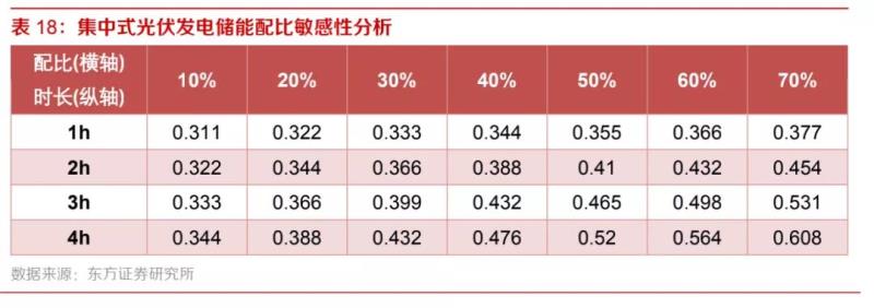 按照光伏儲(chǔ)能配比10%,儲(chǔ)能時(shí)長(zhǎng)2h計(jì)算,5MW的光伏設(shè)備配備容量為1MWh的儲(chǔ)能設(shè)備,儲(chǔ)能設(shè)備EPC總價(jià)為140萬元,按照每年運(yùn)維費(fèi)用為EPC總價(jià)1%,儲(chǔ)能設(shè)備壽命十年計(jì)算,總運(yùn)維費(fèi)用為14萬元。假設(shè)光伏設(shè)備年均有效工作時(shí)長(zhǎng)1400小時(shí),則十年總計(jì)發(fā)電量為70GWh。將儲(chǔ)能成本平攤至光伏發(fā)電的度數(shù),計(jì)算得到對(duì)應(yīng)儲(chǔ)能設(shè)備度電成本為0.022元/kWh。疊加國(guó)內(nèi)目前集中式光伏發(fā)電站0.3元/kWh的度電成本,配備儲(chǔ)能設(shè)備后的度電成本約為0.322元/kWh??紤]到未來配比逐步上升的趨勢(shì),我們進(jìn)一步進(jìn)行敏感性分析,計(jì)算不同配比比例和儲(chǔ)能時(shí)長(zhǎng)要求下的度電成本(光伏+儲(chǔ)能),結(jié)果如下表所示: