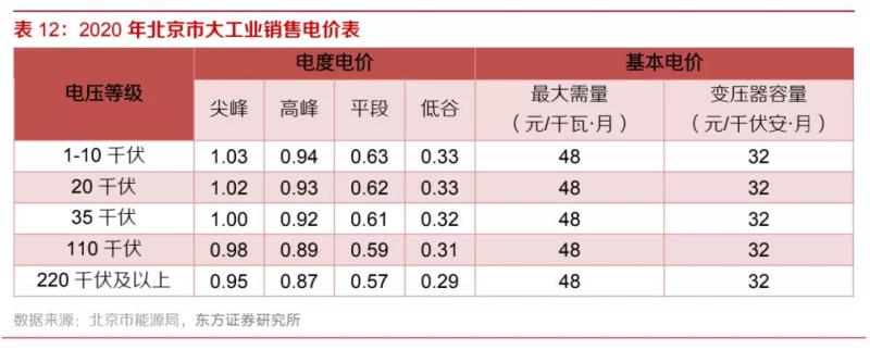 工商業(yè)相比于家庭光儲(chǔ)設(shè)備應(yīng)用的差異主要包括以下幾個(gè)方面:(1)廠房和倉(cāng)庫(kù)上較為充足的空間,使得空間不再成為主要限制因素,工商業(yè)光儲(chǔ)設(shè)備在我國(guó)已有諸多應(yīng)用;(2)工廠的生產(chǎn)時(shí)段與光伏設(shè)備發(fā)電高峰大致重合,光伏設(shè)備發(fā)電以自發(fā)自用為主;(3)對(duì)大規(guī)模用電企業(yè)采用兩部制電價(jià)定價(jià)方法,即電費(fèi)由與容量成比例的固定容量電價(jià)和與用電量成比例的可變用電量電價(jià)組成。下表是以北京市為例的工商業(yè)用電價(jià)格組成表。根據(jù)以上特點(diǎn),我們認(rèn)為光伏工商業(yè)光儲(chǔ)設(shè)備的經(jīng)濟(jì)性主要來源于自發(fā)自用和降低容量電價(jià)。