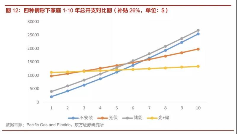 按照上述4kW光伏配比10kWh儲(chǔ)能設(shè)備的家庭光儲(chǔ)組合計(jì)算,儲(chǔ)能設(shè)備EPC總價(jià)為4000美元,按照每年運(yùn)維費(fèi)用為EPC總價(jià)1%,儲(chǔ)能設(shè)備壽命十年計(jì)算,總運(yùn)維費(fèi)用為400美元。假設(shè)光伏設(shè)備年均有效工作時(shí)長(zhǎng)1400小時(shí),則十年總計(jì)發(fā)電量為56000kWh。將儲(chǔ)能成本平攤至光伏發(fā)電的度數(shù),計(jì)算得到對(duì)應(yīng)儲(chǔ)能設(shè)備度電成本為0.079美元/kWh。疊加國(guó)內(nèi)目前分布式光伏發(fā)電站0.45元/kWh的度電成本(約合0.069美元/kWh),配備儲(chǔ)能設(shè)備后的度電成本約為0.15美元/kWh,低于購(gòu)電價(jià)格。