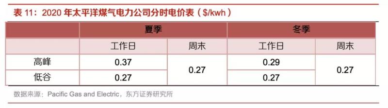 根據(jù)美國(guó)和加州地區(qū)最大的電力和天然氣供應(yīng)商之一太平洋煤氣電力公司(Pacific Gas and Electric)提供的電力分時(shí)價(jià)格計(jì)劃,電價(jià)按照工作日高峰期(17:00-20:00)、工作日低谷期(其余時(shí)段)、周末三種情形分類定價(jià),三類時(shí)段在夏季(6月1日-9月30日)和冬季(10月1日-次年5月31日)又適用于不同的定價(jià)方案,具體如下表所示。我們認(rèn)為加州冬季平均溫度在10℃以上,供暖需求較小,而夏季有制冷需求,因而夏季用電2500kWh,冬季(除夏季外)用電4800 kWh;每日的高峰時(shí)段用電量占當(dāng)日用電總量20%。