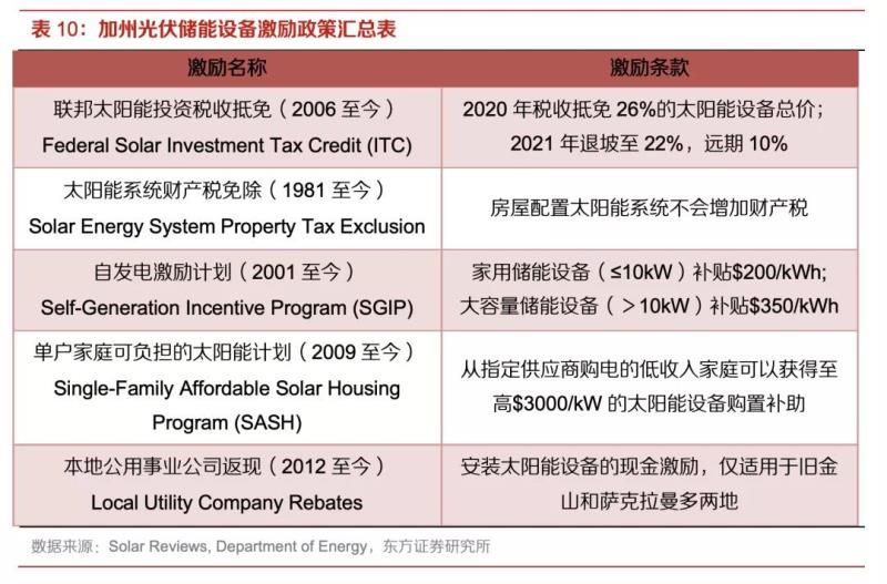 在家用分布式光伏設(shè)備或是光儲(chǔ)設(shè)備上的應(yīng)用方面,歐美國(guó)家相對(duì)較為領(lǐng)先。我們以美國(guó)加州為例,對(duì)一個(gè)典型家庭的裝機(jī)決策做經(jīng)濟(jì)性分析。得天獨(dú)厚的自然環(huán)境、分時(shí)電價(jià)和設(shè)備補(bǔ)貼等一系列因素使得美國(guó)加州成為全美光伏發(fā)電最繁榮地區(qū)。根據(jù)SEIA (Solar Energy Industries Association) 的統(tǒng)計(jì)數(shù)據(jù),截至2020年第三季度末,加州光伏總裝機(jī)量為29218.17MW,全州22.27%的電量來自光伏發(fā)電,總裝機(jī)量排名全美第一。按照加州的發(fā)展目標(biāo),到2045年100%的電力都將由清潔能源供應(yīng),到2050年將實(shí)現(xiàn)溫室氣體減排80%(基準(zhǔn)年:1990年)的目標(biāo)。加州對(duì)于光伏和儲(chǔ)能設(shè)備出臺(tái)了系列激勵(lì)政策,包括稅收優(yōu)惠、補(bǔ)貼等。