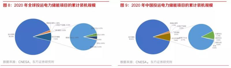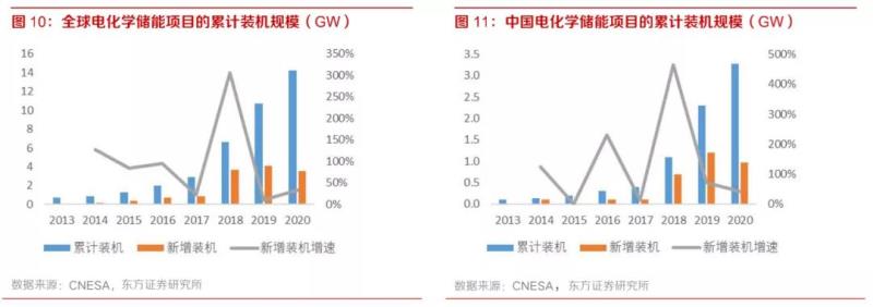 截至2020年底,全球已投運(yùn)儲(chǔ)能項(xiàng)目累計(jì)裝機(jī)容量達(dá)到191.1GW,同比增長(zhǎng)3.4%,電化學(xué)儲(chǔ)能中鋰離子電池的累計(jì)裝機(jī)規(guī)模最大為14.2GW;中國(guó)已投運(yùn)的儲(chǔ)能項(xiàng)目累計(jì)裝機(jī)規(guī)模達(dá)到35.6GW,同比增長(zhǎng) 9.8%,裝機(jī)規(guī)模占全球的18.6%。由于商業(yè)化應(yīng)用較早、與傳統(tǒng)電力系統(tǒng)應(yīng)用場(chǎng)景的深度結(jié)合,抽水蓄能在中國(guó)和全世界范圍的儲(chǔ)能占比都超過90%,但是該比例在逐年下降。與此同時(shí),電化學(xué)儲(chǔ)能的規(guī)模和占比快速提升:2013年到2020年,全球和中國(guó)電化學(xué)儲(chǔ)能累計(jì)規(guī)模分別從0.7GW和0.1GW增長(zhǎng)至14.25GW和3.27GW,CAGR分別為53.8%和64.6%;電化學(xué)儲(chǔ)能中鋰離子電池儲(chǔ)能的裝機(jī)占比在全球和中國(guó)分別為92.0%和88.8%,是電化學(xué)儲(chǔ)能中的絕對(duì)主力和發(fā)展方向。從累計(jì)裝機(jī)容量上來看,2020年全球電化學(xué)儲(chǔ)能累計(jì)裝機(jī)容量14.25GW,中國(guó)電化學(xué)儲(chǔ)能累計(jì)裝機(jī)容量3.3GW,目前中國(guó)的儲(chǔ)能裝機(jī)容量在全球的占比并不是很高,但中國(guó)市場(chǎng)增速明顯,2020年增速達(dá)42%。