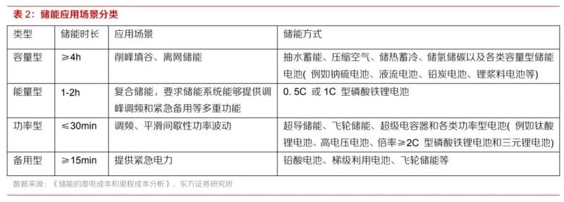從能量的角度分類,儲(chǔ)能技術(shù)主要可以分為熱儲(chǔ)能、電儲(chǔ)能和氫儲(chǔ)能幾大類,其中電儲(chǔ)能包括機(jī)械儲(chǔ)能、電化學(xué)儲(chǔ)能和電磁儲(chǔ)能,是最常用的儲(chǔ)能方式。根據(jù)儲(chǔ)能時(shí)長(zhǎng)的不同,可以將儲(chǔ)能的應(yīng)用場(chǎng)景分為容量型、能量型、功率型和備用型。不同的儲(chǔ)能技術(shù)適用于不同的場(chǎng)景。