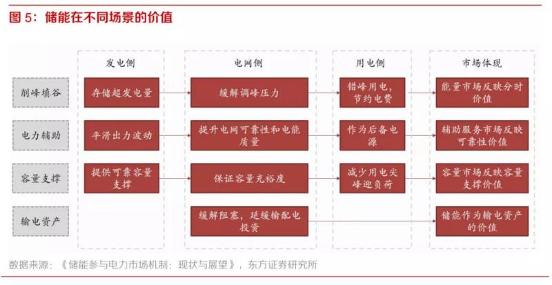 在風(fēng)電和光電裝機(jī)量不斷提升的大背景下,發(fā)展儲(chǔ)能技術(shù)是解決供需匹配問題、減小風(fēng)光波動(dòng)性對(duì)電網(wǎng)沖擊的必由之路。一方面,通過削峰填谷,可以解決峰谷時(shí)段發(fā)電量與用電負(fù)荷不匹配的問題;另一方面,可以參與提供電力輔助服務(wù),解決風(fēng)光發(fā)電的波動(dòng)性和隨機(jī)性導(dǎo)致的電網(wǎng)不穩(wěn)定;此外,通過儲(chǔ)能系統(tǒng)的存儲(chǔ)和釋放能量,提供了額外的容量支撐;在一定程度上,儲(chǔ)能可以增加電量本地消納,減少輸電系統(tǒng)的建設(shè)成本。儲(chǔ)能可以應(yīng)用在發(fā)電側(cè)、電網(wǎng)側(cè)和用電側(cè),在不同場(chǎng)景下具有不同的價(jià)值和意義。