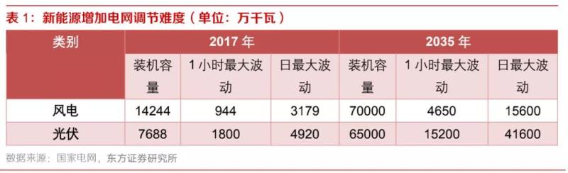 根據(jù)國(guó)家電網(wǎng)的測(cè)算,2035年前,風(fēng)、光裝機(jī)規(guī)模分別將達(dá)到7億、6.5億千瓦,全國(guó)風(fēng)電、太陽(yáng)能日最大波動(dòng)率預(yù)計(jì)分別達(dá)1.56億、4.16億千瓦,大大超出電源調(diào)節(jié)能力,迫切需要重新構(gòu)建調(diào)峰體系,以具備應(yīng)對(duì)新能源5億千瓦左右的日功率波動(dòng)的調(diào)節(jié)能力。