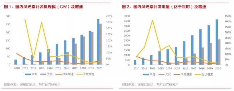 為了實(shí)現(xiàn)雙碳目標(biāo),新能源發(fā)電裝機(jī)快速增長(zhǎng)。2020年9月,習(xí)近平主席在第75屆聯(lián)合國(guó)大會(huì)上 提出中國(guó)將力爭(zhēng)在2030年前實(shí)現(xiàn)碳排放達(dá)峰、2060年前實(shí)現(xiàn)碳中和的目標(biāo)。為了實(shí)現(xiàn)碳中和碳達(dá)峰的目標(biāo)。新能源發(fā)電技術(shù)受益于其零排放的優(yōu)勢(shì),得到了快速發(fā)展。截至2020年末,全國(guó)風(fēng)電、光伏累計(jì)裝機(jī)規(guī)模達(dá)253.4GW和 281.7GW,同比增長(zhǎng)24.1%和34.1%;2020年全國(guó)光伏、風(fēng)電新增裝機(jī)達(dá)48.2GW和71.7GW,同比大幅增長(zhǎng)60.1%和177.9%。新能源發(fā)電方面,2020年光伏、風(fēng)電發(fā)電量占比進(jìn)一步提高至3.5%和6.3%